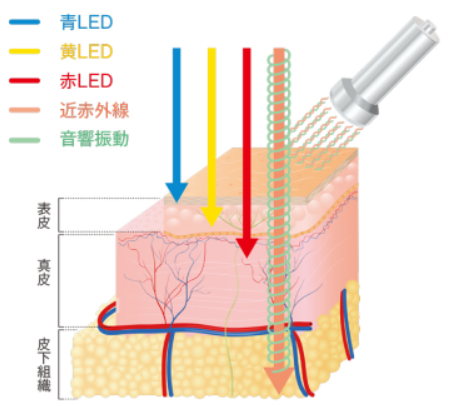 身体に関係なく、皮膚の奥に浸透するLEDライト「近赤外線」と、皮膚の表面にゆらぎを与える「音響振動」によって、今までの技術では難しかった身体へのアプローチを可能にします。